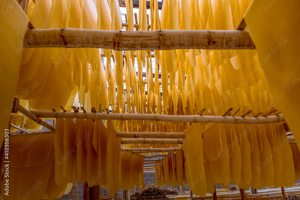 The farmer making rubber sheets hang on bamboo process dry by solar energy . A raw rubber latex flat to dry. Rubber sheet is a raw material for many industrial product.