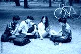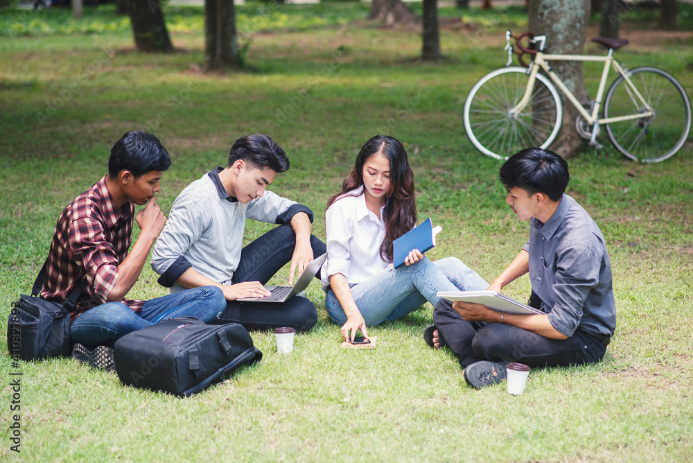 Group of Diversity Student working on laptop and smart phone together at university, Happy multi ethnic friend successfully completes the thesis report and passed the final exam in asian college.