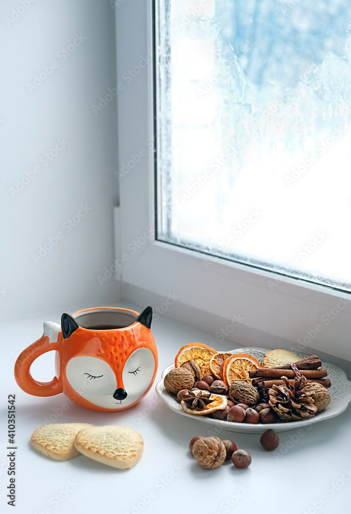 tea Cup, cookies, nuts, cinnamon and frosty window. cozy winter season. atmosphere hugge home concept.