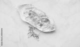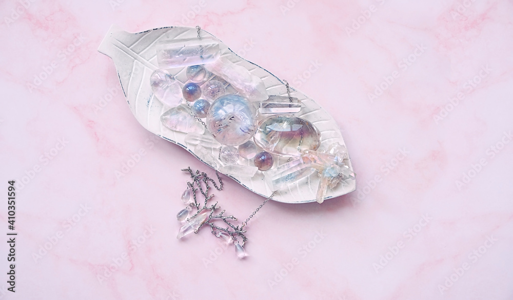beautiful quartz minerals on plate. Magic gemstones for Crystal Ritual. Witchcraft, Relaxing Chakra, Healing stones. spiritual practice, Esoteric and life balance concept. flat lay