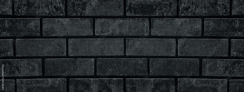 Black shabby brick wall close-up wide texture. Dark grey brickwork grunge widescreen background