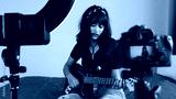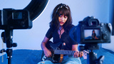 Young woman playing guitar in front of the camera. recording demo or giving online class. High quality photo
