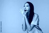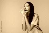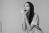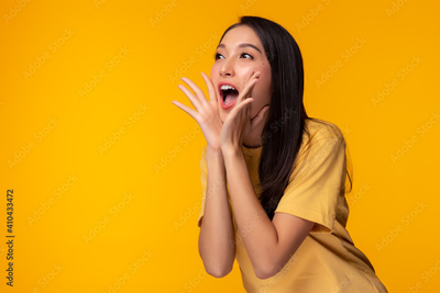 Surprised happy beauty asian woman looking copy space in excitement. Expressive facial expressions. Presenting some product. Beautiful girl act like a telling secret Isolated on yellow background