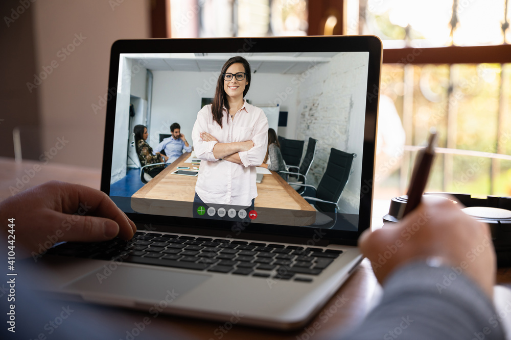 Business online course of a leader coach teacher live on the participant's laptop - Video call between co-workers in smart working from home and office - University student during exam with professor