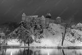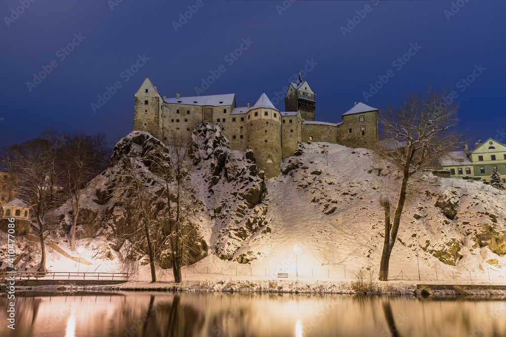 Stunning scenic view of beautiful cityscape of medieval Loket nad Ohri town with Loket Castle gothic style on massive rock, colorful buildings during winter season, Karlovy Vary Region, Czech Republic