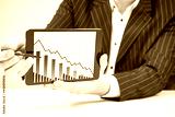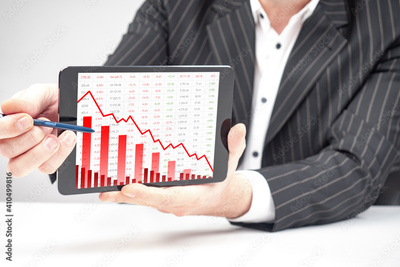 Trader shows correction chart tablet screen. Concept of correction stock market due to trading short positions. Correction of share prices due conflict with private investors. Stock market analysis