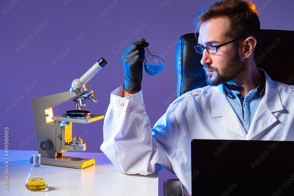 Laboratory researcher next to microscope. Laboratory assistant examines filled test tube. Laboratory researcher is sitting with laptop. Concept - scientific research. He records his studies on laptop