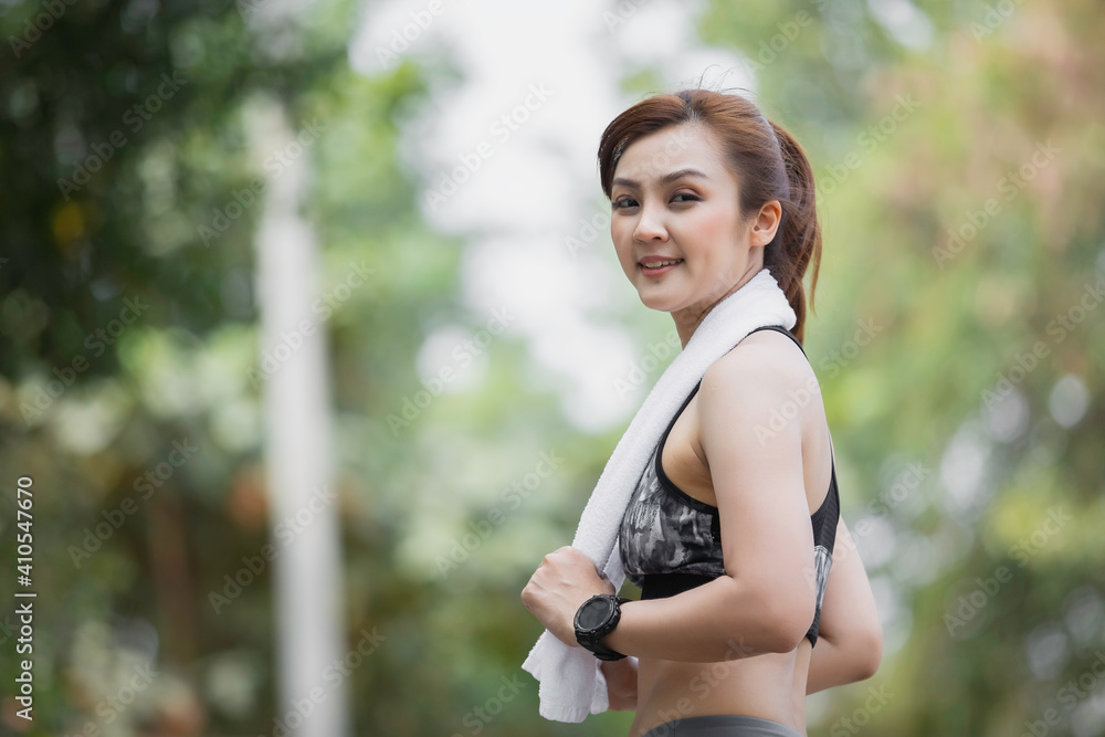 Asian young woman sportswear outdoor physical exercises for successfull health.
