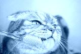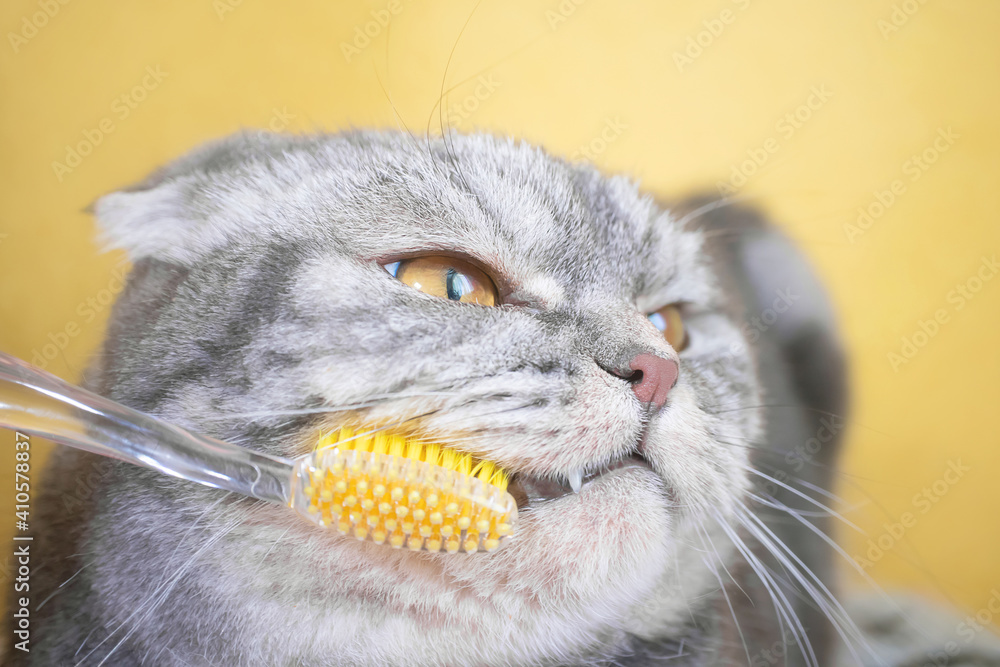 Gray scottish fold cat close-up with a toothbrush. Yellow background. Pet oral hygiene concept.