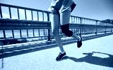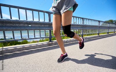fitness, sport and healthy lifestyle concept - feet of young woman with knee brace running outdoors