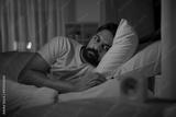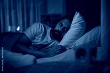 sleeping, insomnia and people concept - sleepless indian man lying in bed at home at night