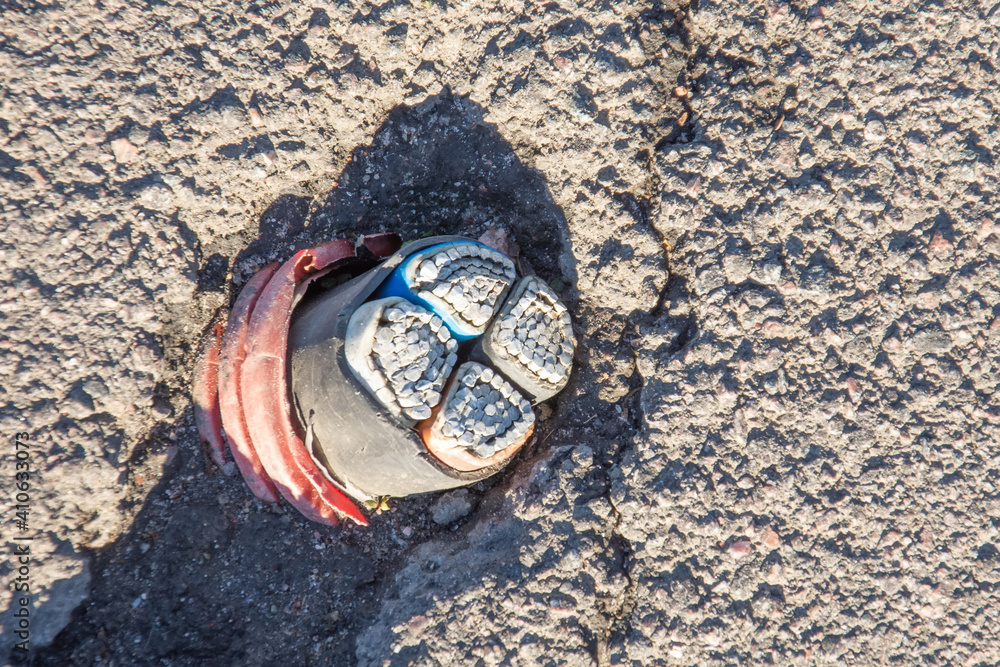 High voltage electric cable torn off sticking out of the ground under the asphalt, accident.