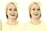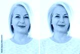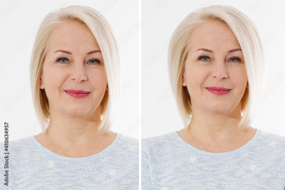 Before after thin hair and more valume hairstyle. Big volumized healthy hairstyling. Haircut and haircare concept. Blond middle aged woman before-after using shampoo and cosmetic products. Short hair