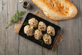 Traditional Georgian dumplings with meat. Khinkali. Served on a plate with traditional Georgian bread.