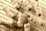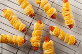 Sausage baked in puff pastry. Sprinkled with sesame seeds, served with sauce.