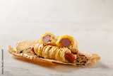 Sausage baked in puff pastry. Sprinkled with sesame seeds, served with sauce.