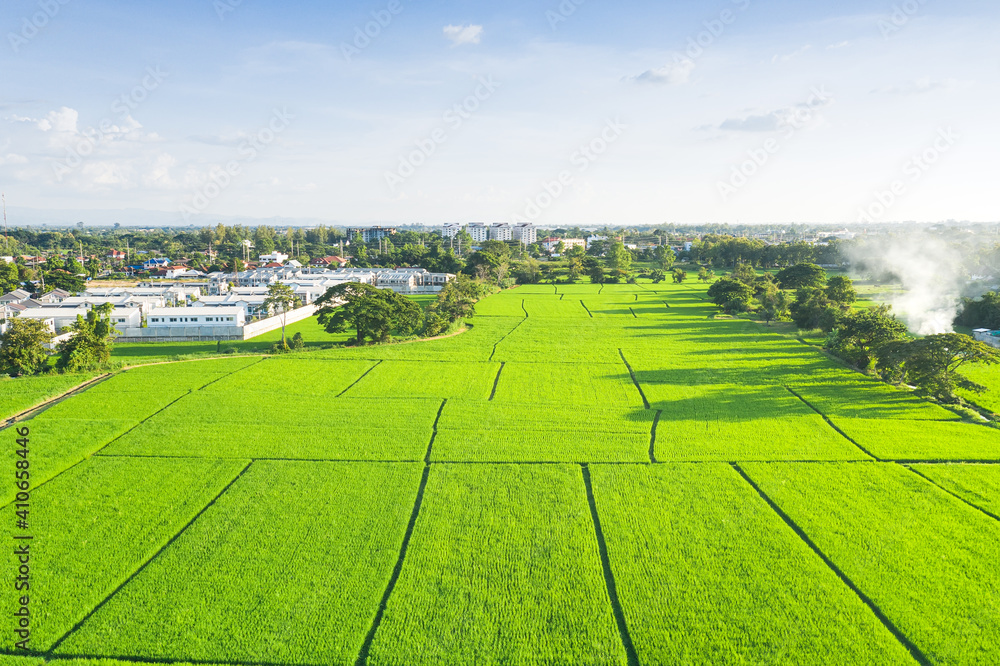 Land, landscape of green field in aerial view. Land on earth for agriculture farm, farmland, plantation with texture pattern of crop, rice, paddy. Rural area with nature at countryside in Chiang mai.