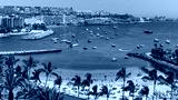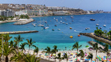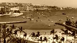 Summer landscape with a beach with people bathing, hotels and boats anchored in the sea. Gran Canaria. Arguineguin.
