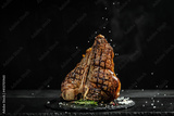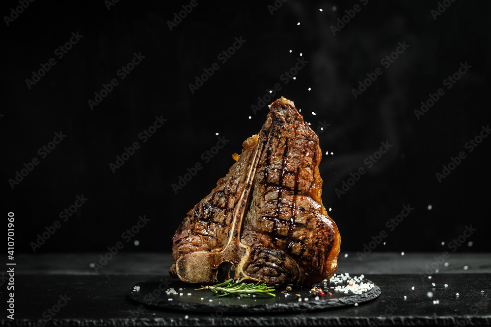 The T-bone or porterhouse steak of beef cut from the short loin. steaksT-shaped bone with meat on each side. banner, catering menu recipe place for text