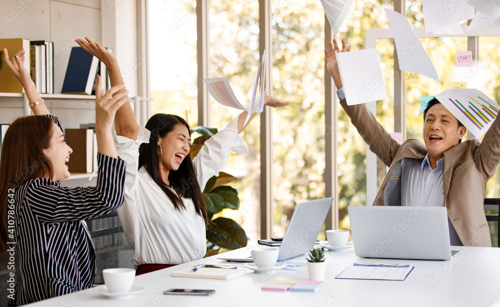 portrait of young cheerful Asian women office workers celebrating smiling happily by throwing paperwork to the air in a meeting room. Confident and successful people concept