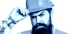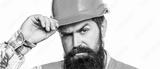 Builder in hard hat, foreman or repairman in the helmet. Man builders, industry. Bearded man worker with beard in building helmet or hard hat. Black and white