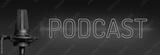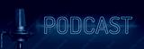 Podcast purple banner with studio microphone, neon sign and luminous waveform