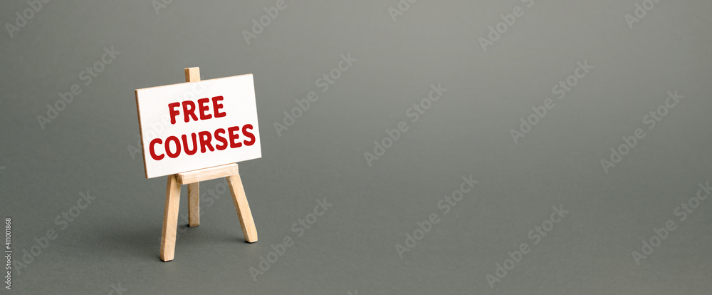 Stand with the words Free courses. Free education concept. Online webinars and trainings. Accessible studying. Place for text. Copy space