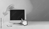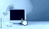 Retro vintage computer monitor with tropical palm leaf. Blue and purple colored lights. Creative minimal cyberwave background. Retro futurism.