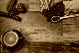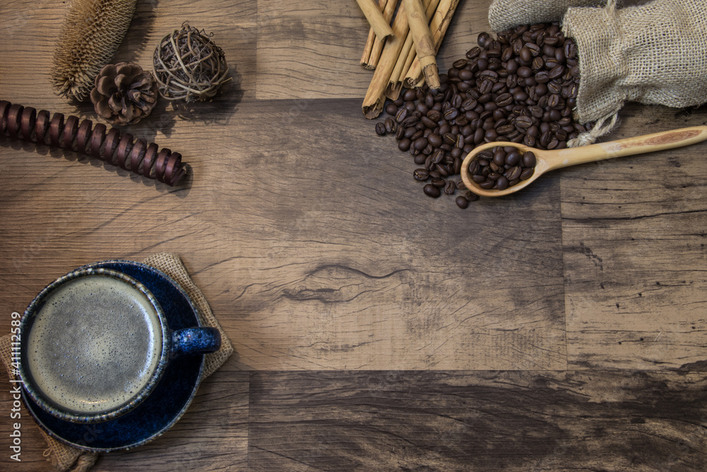 cup of coffee on wooden table accompanied by natural coffee beans and cinnamon
