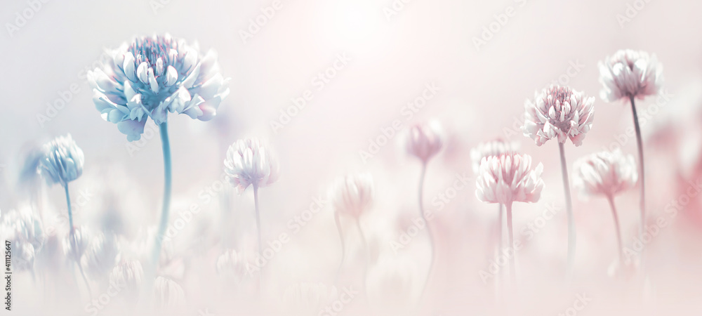 Delicate flowers of clover in pastel colors. Spring summer blur background. Copy space.