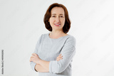Middle aged woman healthy and happy lifestyle after menopause. Beautiful close up portrait mid age brunette woman. female isolated on white background with copy space. Menopausal and healthcare.