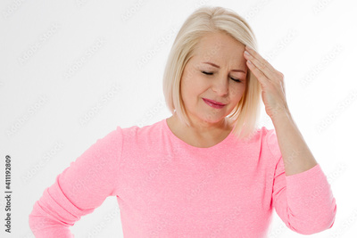 Women Hormonal Headaches. Closeup Middle aged woman with Menopause migraines isolated on white background. Copy space. Strong and hard female pain. Depression and stress health problem.
