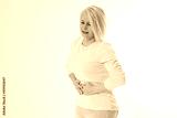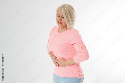 Abdominal pain. Middle aged woman with stomach pain. Menopausal woman with stomach-ache. Healthy and happy menopause lifestyle. Anti aging healthcare concept. Copy space. Isolated on White background
