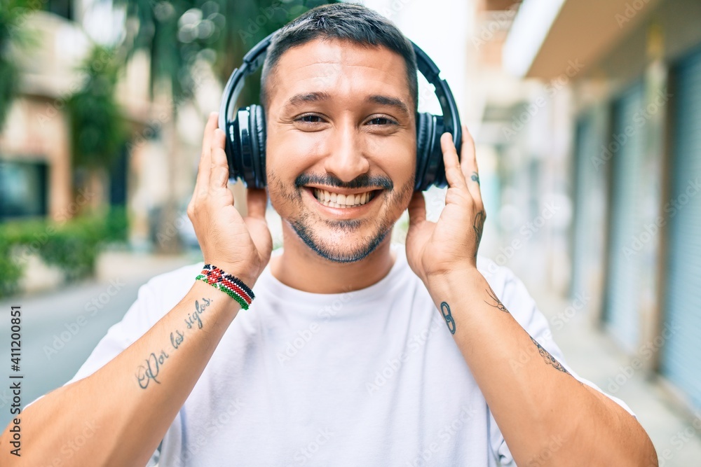 Young hispanic man smiling happy listening to music using headphones at street of city.