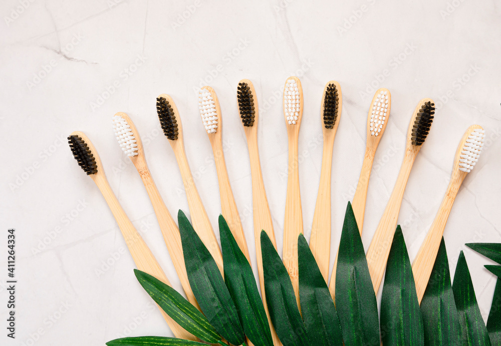 Lots of bamboo toothbrushes and green leaves on a white marble background with free space for text or message. Oral care concept. top view. Flat lay. copy space