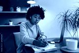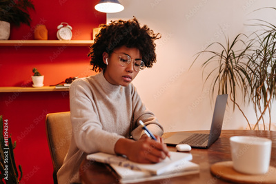 Girl in glasses and headphones intently writes in notebook, learns and listens to audio book