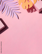 Hand cut paper tropical plants leaves on the pink background. Summer concept Top view. Copy space