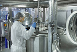 Side view portrait of young woman wearing mask and protective wear while working at food factory, copy space