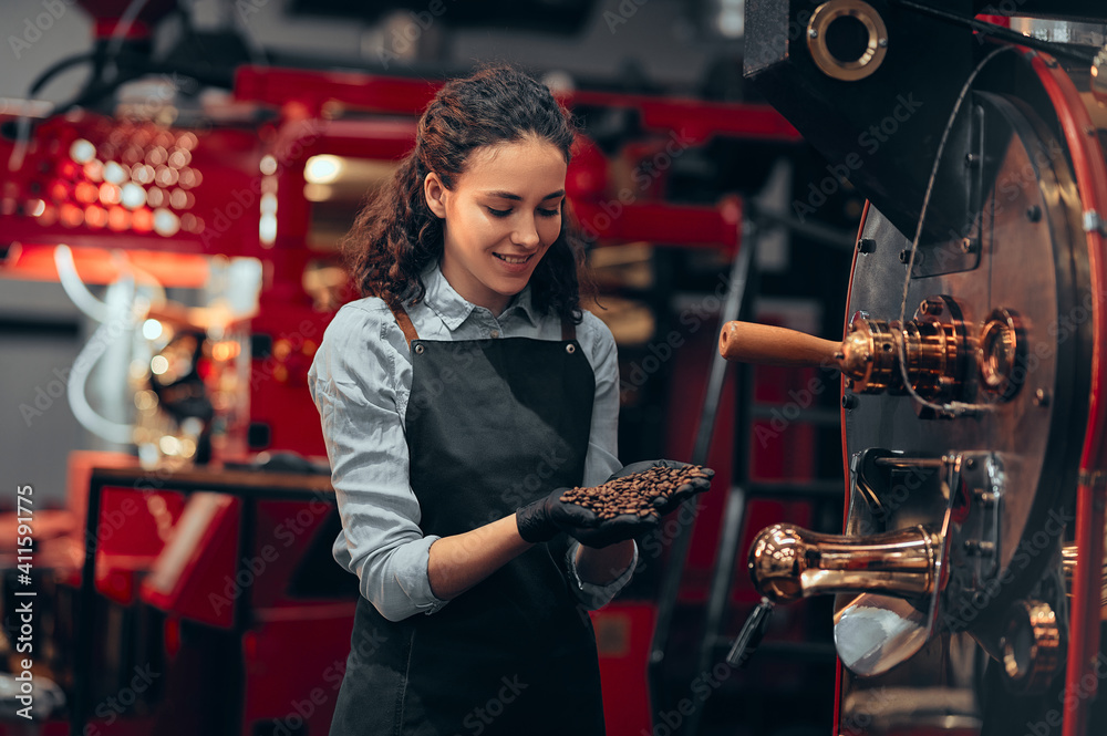Woman checking the quality of the coffee beans standing near the roaster machine at the roastery. Mixing roasted coffee.