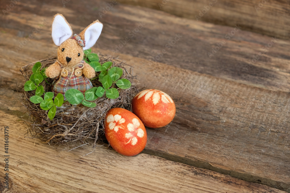 Easter bunny in nest and eggs on wooden table. egg, boiled in onions peels. Natural ecological paints staining. Easter holiday. spring festive season