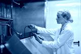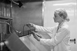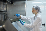 Side view portrait of young female worker holding temperature meter while probing mixture at industrial food factory, copy space