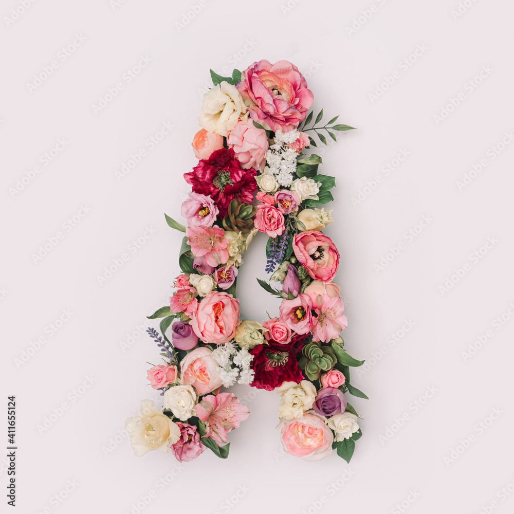 Letter A made of real natural flowers and leaves. Flower font concept. Unique collection of letters and numbers. Spring, summer and valentines creative idea.