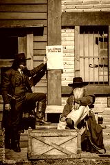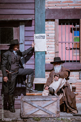 Cowboys group under taking in saloon bar at village ,they showing gun weapon on hand to protect from rob man.