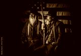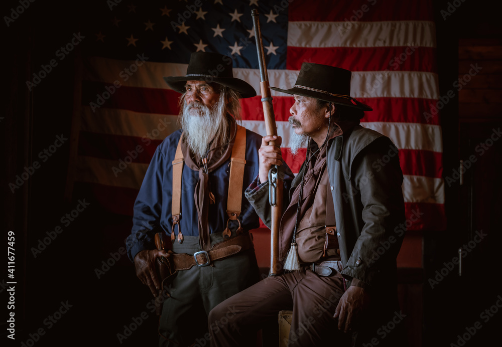 Cowboy posing with rifle gun on hand to show protected weapon ,vintage style