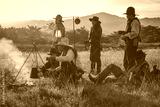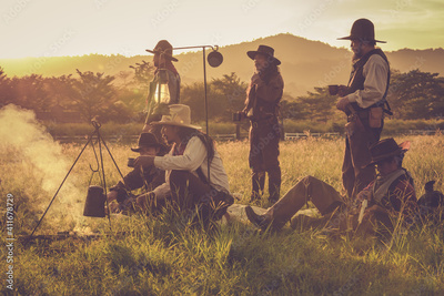 Cowboys group have outdoor camping with their horses and boiling coffee in morning before travel avenger