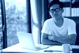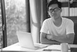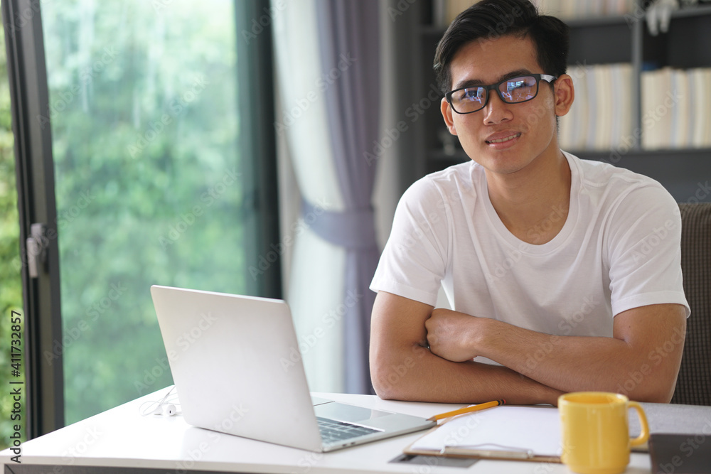 asian young student man entrepreneur working with computer studying learning online at home. e-learning webinar meeting. social distance in covid pandemic
