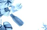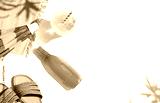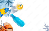 Bright summer vacation or travel lifestyle concept banner with flip flops, lemonade and sunscreen spray. Top view. Copy space