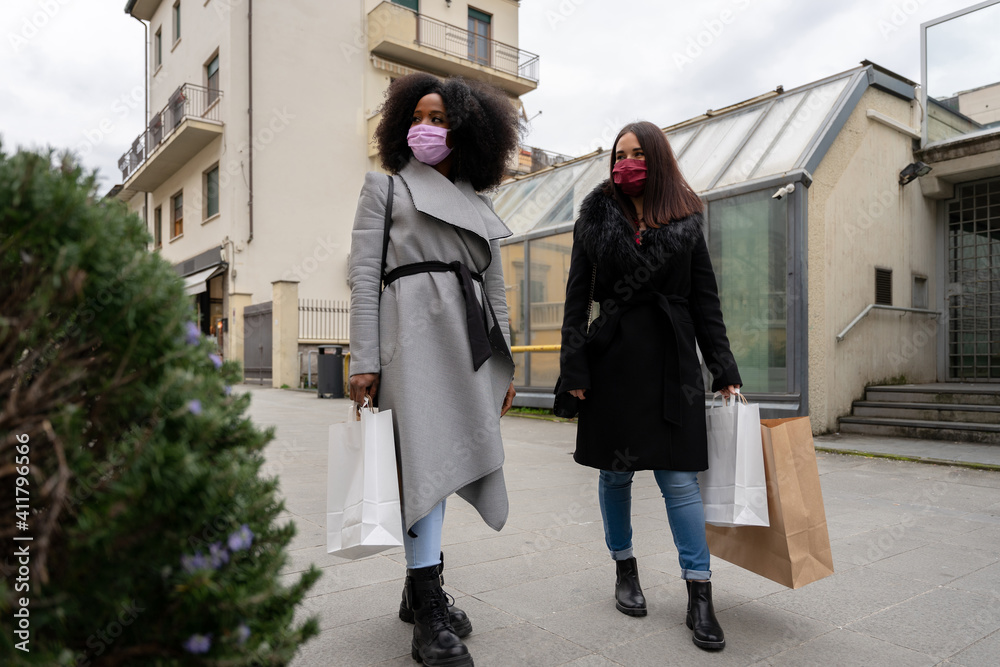 Two young friends are looking a store during the sales - They are wearing protective face masks against Covid-19 infections, Coronavirus - Millennials shop together in city with shopping bags in hands