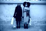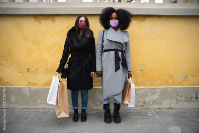 Two young friends go shopping during sales - Wearing protective face masks against Covid-19 infections, Coronavirus - Millennials shop together in city with bags in hands - Portrait on a yellow wall