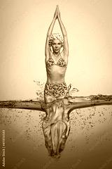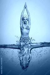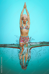 Portrait of a young woman wearing a retro swimsuit, diving into water